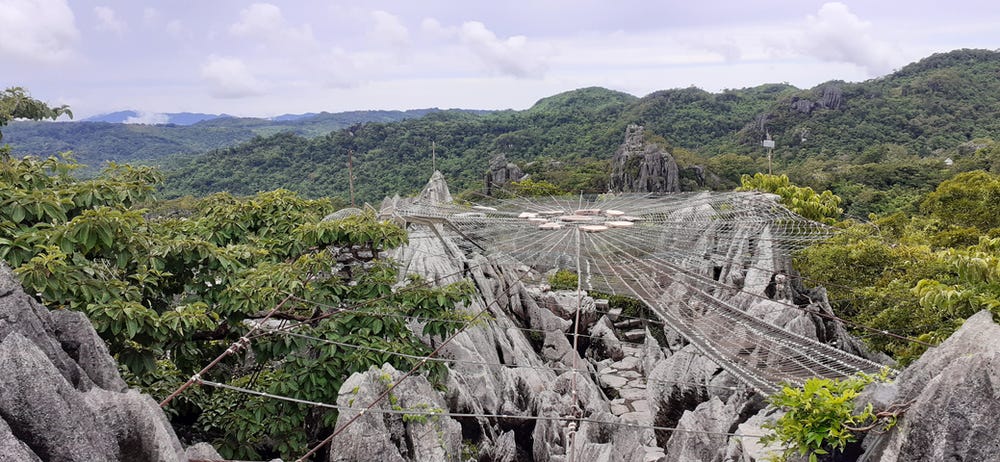 Non-intrusive, non-destructive approach to showcasing the geological formations: karst landscapes are fragile and easily damaged. In Masungi, the rangers have made a concerted effort to design ropeways, bridges, walkways and dedicated paths to allow you to explore the park. It is quite an adventure making your way across the dangling, suspended bridges and the knotted, woven nets that offer views of the sheer landscape below (if like me, you have a fear of heights). A local guide accompanies you throughout the trail, drawing your attention to the interesting rock formations, the flora and fauna, and the fragility of the landscape you've ventured into. Similarly, on the Puerto Princesa river cruise, the audio guides and rowed canoes ensure minimal noise and disturbance. The boatsmen are adept at navigating past the cave formations without damaging them, and deftly shining their light onto features of interest.